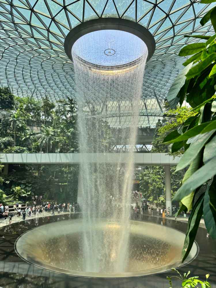 Direkt nach der Landung sollte man bevor man in die Stadt reinfährt einen kleinen Abstecher zur Jewel Changi Mall machen um sich einzustimmen. Man kann einfach mit seinem Koffer hinüberlaufen. Die Mall ist halb offen gestaltet und wird in der Mitte von einem riesigen künstlichen Wasserfall dominiert, den jeder bestimmt schon oft auf Social Media gesehen hat. Hier macht jeder ein Selfie, ich habe es auch getan. Die beste Sicht auf den Wasserfall hat man übrigens nicht von ganz oben, sondern ein oder zwei Ebenen tiefer.